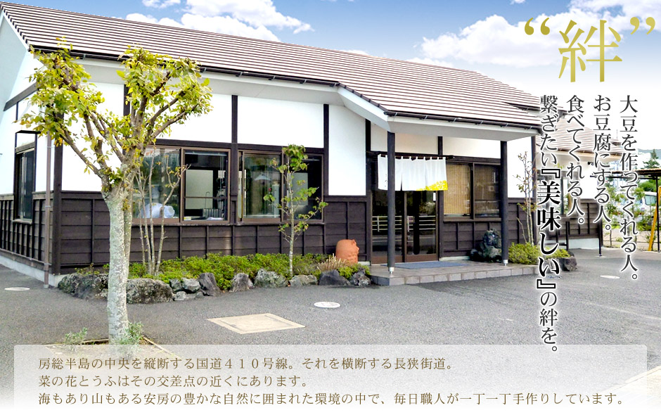 菜の花とうふ 菜の花とうふのふるさと 房総安房の里 〒296-0121 千葉県鴨川市大川面1009-1[マップ] Tel 04-7097-1787 Fax 04-7097-0701 営業時間 10:00~18:00 菜の花とうふのWebサイトはこちらです